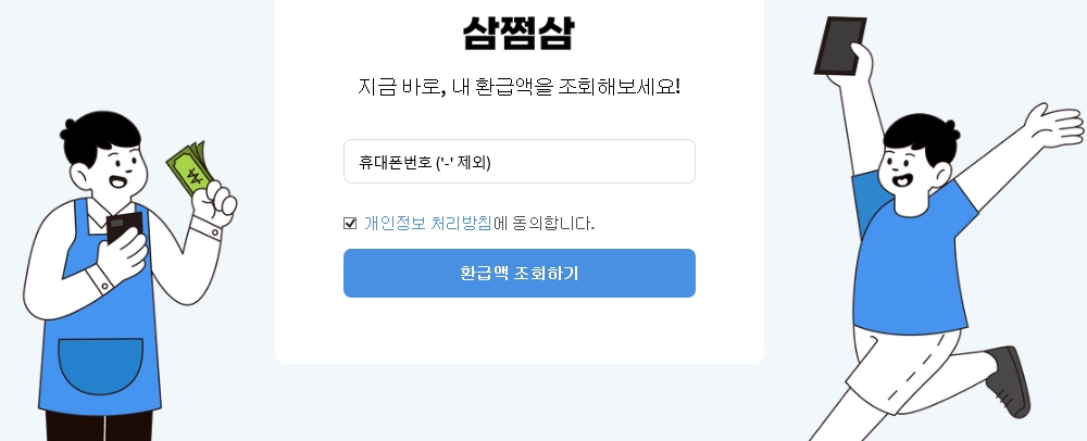 홈페이지로 접속하게 되면 아래와 같이 휴대폰 번호를 입력하는 칸이 나오고 입력후 환급액 조회하기를 클릭하면 된다.