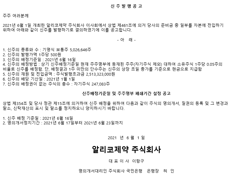 6월1일 금융감독원 전자공시시스템에 따르면 알리코제약은 보통주 1주당 신주 0.5주를 배정하는 50% 무상증자를