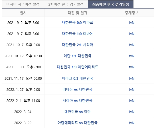최종예선 한국 경기 일정 및 결과