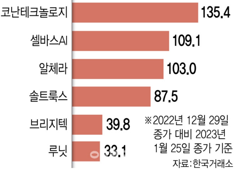 지난해 7월 상장한 AI 기반 검색엔진 솔루션 업체 코난테크놀로지135.40% 상승해 가장 많이 올랐다.