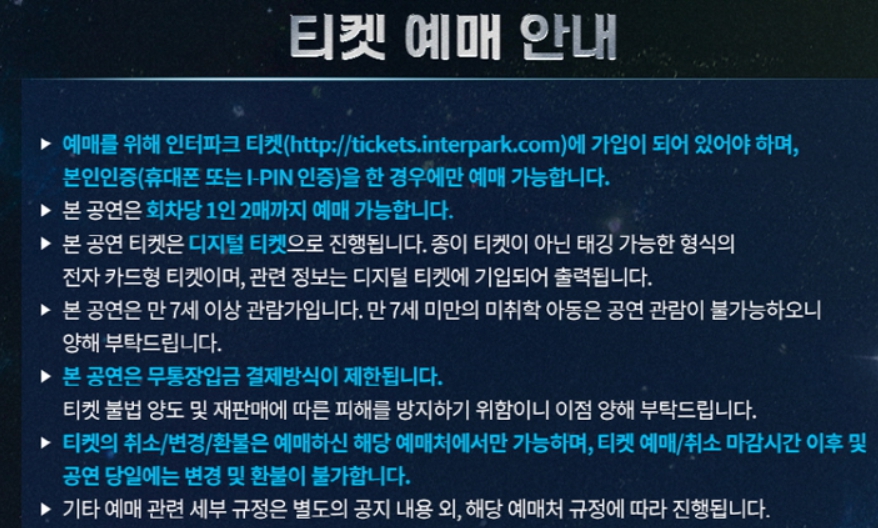 - 티켓 오픈: 2023년 10월 19일(목) 오후 8시이며 회차당 1인 2매 매수 제한이 있다.