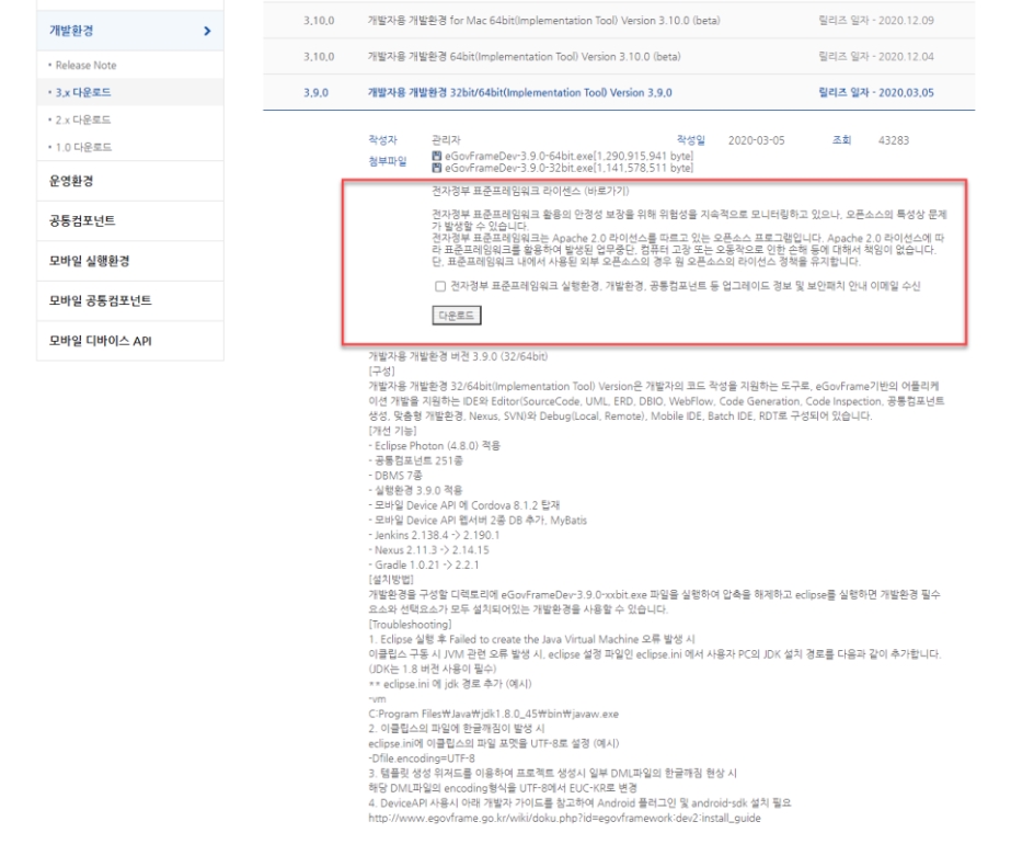 설치 버전은 eGovFramework 3.9의 All in One 버전이다. 이왕이면 최신 버전으로 설치 해보는게 좋을까하여...