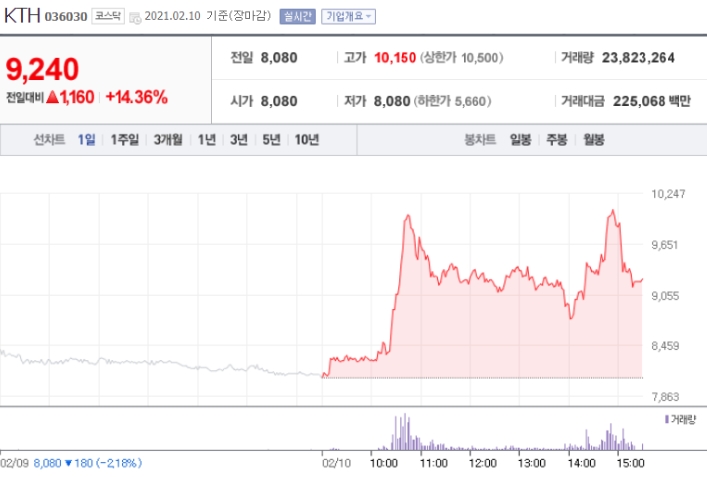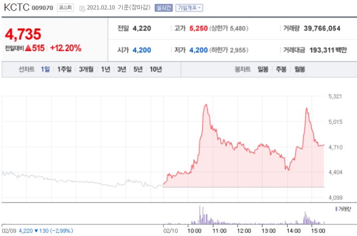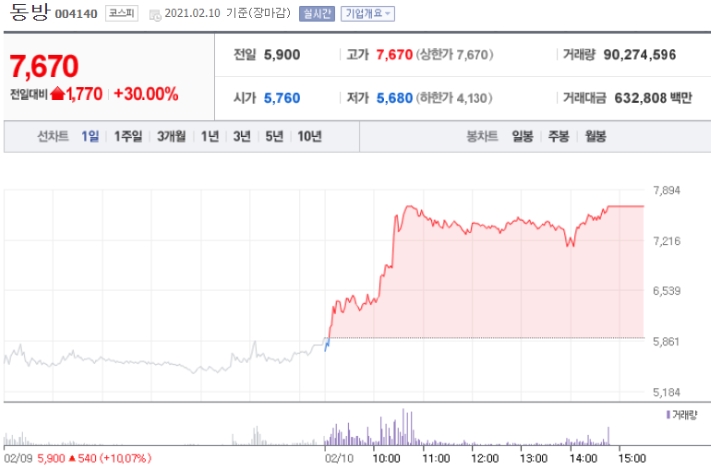 쿠팡의 물류전담 운송사인 동방은 2021년 2월 10일 9000만주 이상 거래량을 기록하며 상한가로 장을 마쳤음.