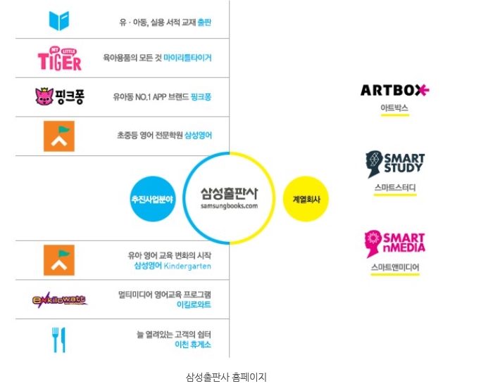 삼성출판사는 유아동 출판물을 주축으로 하여 영억재 및 성인 교양물 휴게소사업, 임대사업을