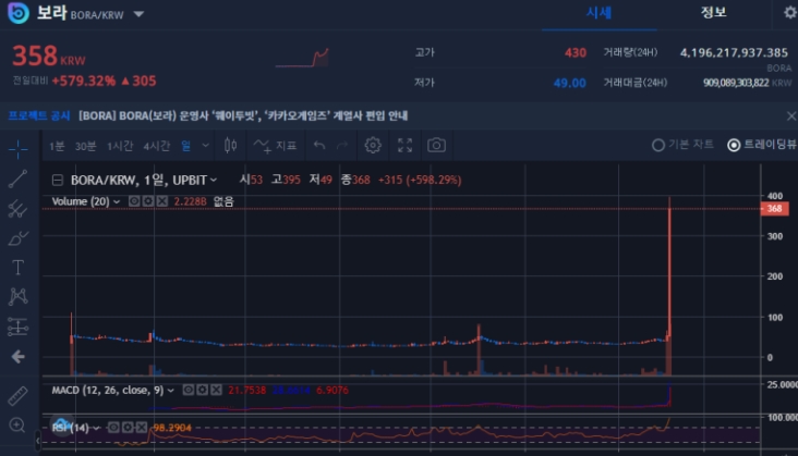 보라코인은 업비트 비트(BTC)마켓과 코인원 원화마켓에 상장되어 있는 가상화폐 종목이다.