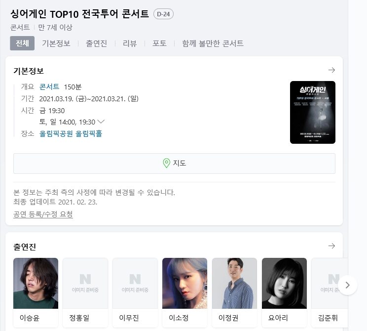 - 공 연 명 : 싱어게인 TOP10 전국투어 콘서트 - 서울 - 공연일정 : 2021년 3월 19일(금) ~ 3월 21일(일) - 공연시간 : 3월 19일(금) pm7:30 / 3월 20일(토) pm2, 7:30 / 3월 21일(일) pm2, 7:30 - 공연장소 : 올림픽공원