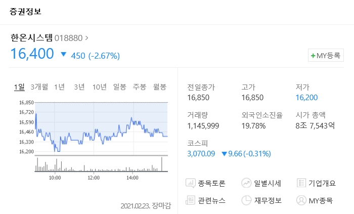 2월23일 한온시스템은 2.67%(450원) 하락한 1만 6400원에 거래를 마쳤다.