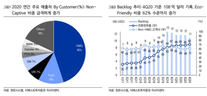 한온시스템은 자동차 내부에 들어가는 열 교환기 관련 사업을 하고 있고 친환경차로 수소차나 전기차 뿐만 아니라