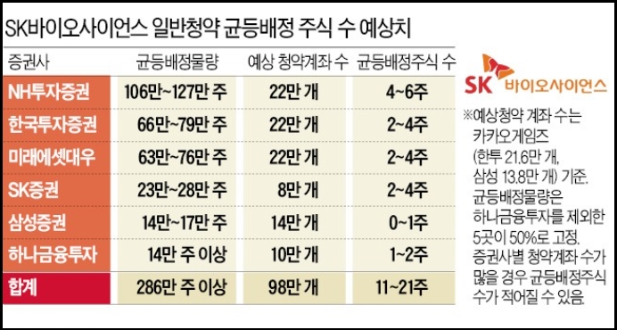 SK바이오사이언스는 전체 공모주식의 25~30%인 573만7500~688만5000주를 개인에게 배정한다.