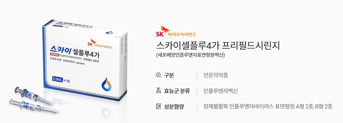SK바이오사이언스가 직접 연구개발한 대표제품은 독감예방에 쓰이는 인플루엔자 백신 '스카이셀플루4가' 입니다.