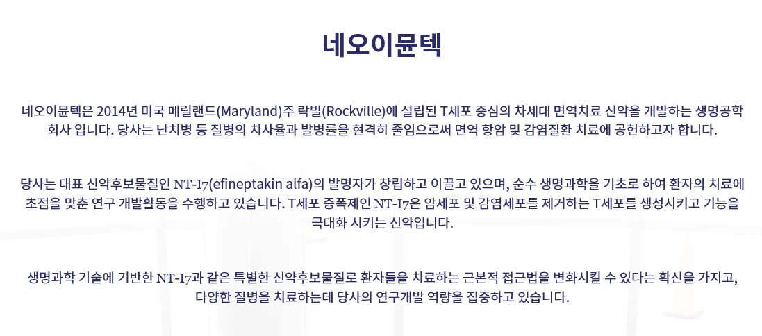 2014년 설립된 네오이뮨텍은 T 세포 중심의 차세대 면역항암 신약을 연구개발하는 생명공학 회사로,