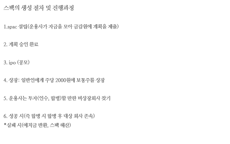 스팩은 기업인수목적으로 만들어진 회사며, 비상장기업과의 인수합병을 한다.