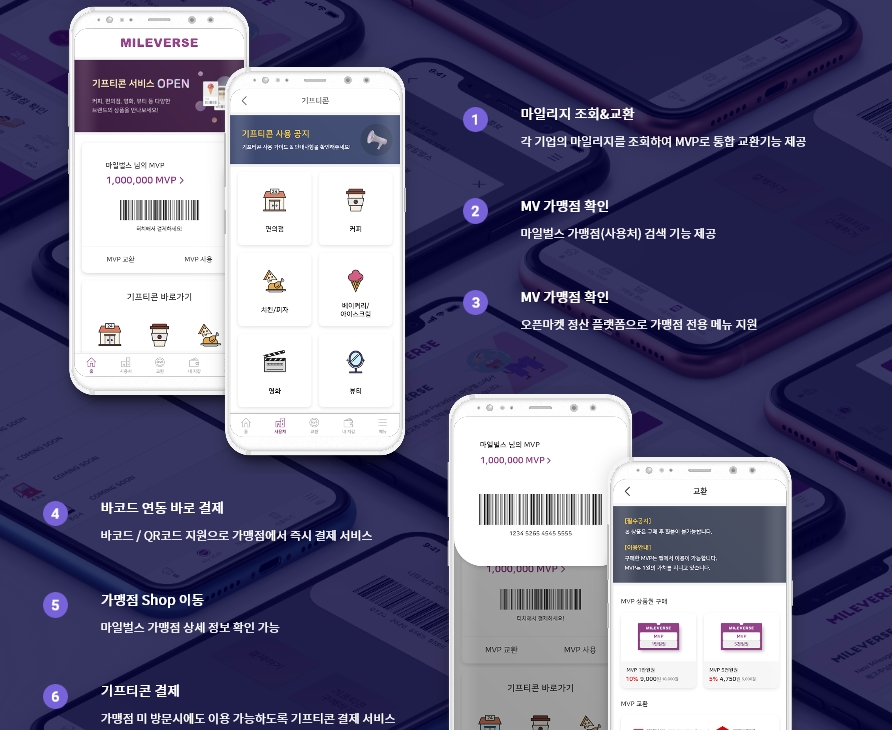 가맹 기업의 마일리지(포인트)를 가상자산 MVP(MileVerse-Point)로 교환해 편의점, 커피전문점 외