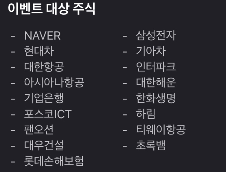 이벤트 대상 종목은 ▲NAVER ▲현대차 ▲기아차 ▲삼성전자 ▲대한항공 등 국내 주식 22개다.